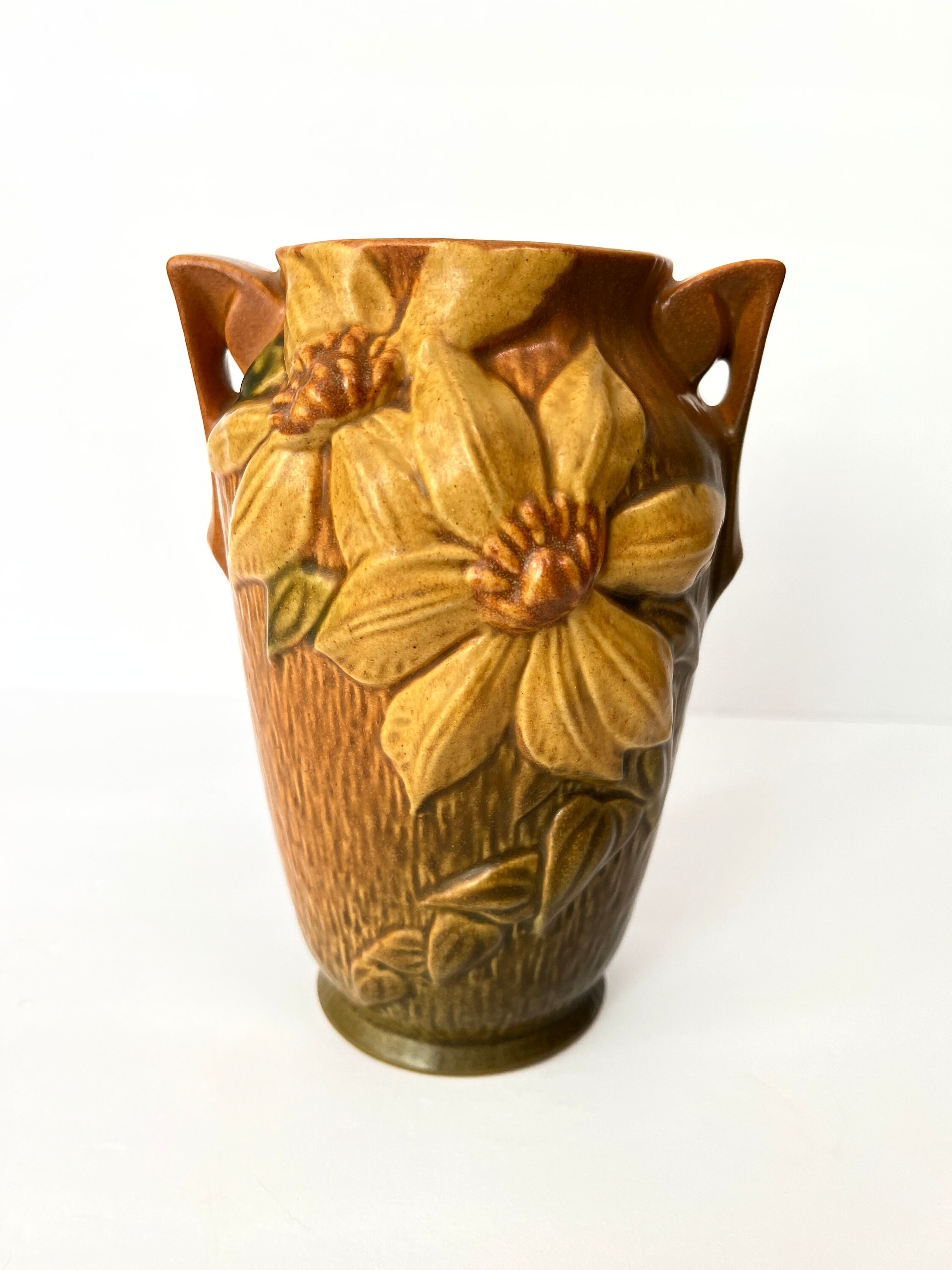 Rare Roseville Pottery Columbine Double Handled Vase Pattern 16 7 Brown Mint Ebay
